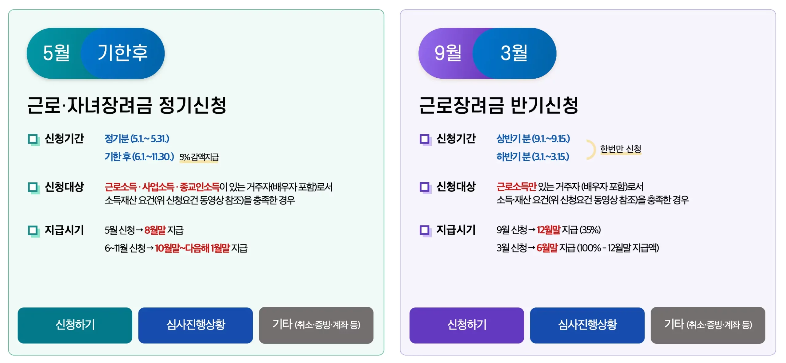 근로장려금은 신청 시기에 따라 정기신청과 기한후신청으로 구분되며, 심사를 거쳐 단계적으로 지급됩니다. 정확한 지급일정은 국세청 홈페이지에서 확인할 수 있습니다.