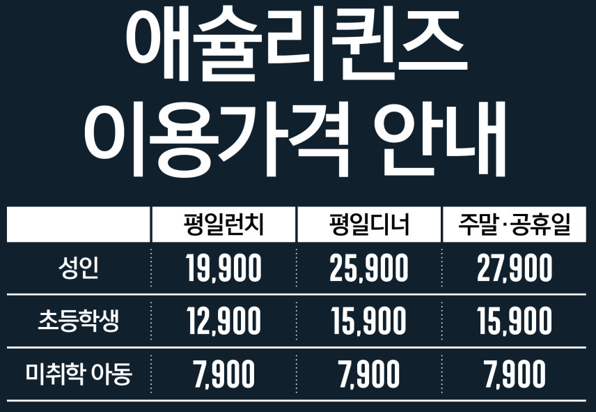 💡 애슐리 퀸즈의 가격은 지점과 위치에 따라 약간의 차이가 있을 수 있습니다.