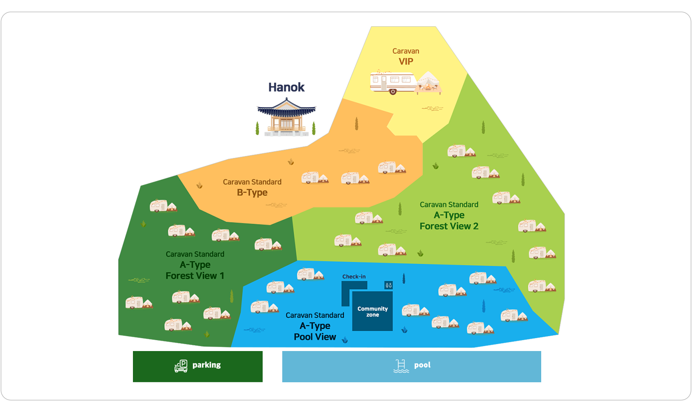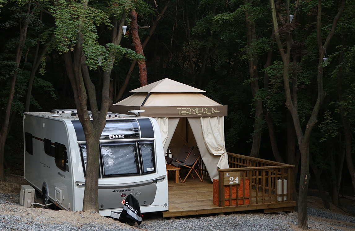 이천테르메덴의 카라반은 캠핑의 낭만을 현대적 편의시설과 결합한 글램핑 스타일의 숙소입니다. 총 세 가지 타입으로 운영되며, 각각의 특징은 다음과 같습니다: