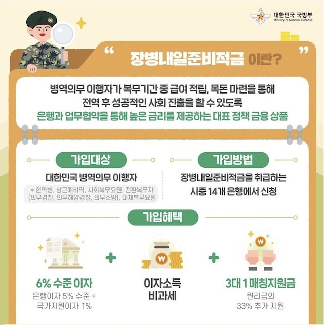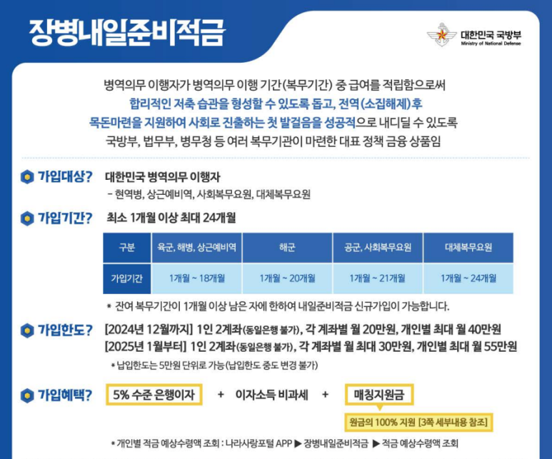 장병내일준비적금은 병역의무를 이행하는 청년들이 전역 후 사회에서 안정적으로 정착할 수 있도록 국가가 마련한 최고의 재정 지원 제도입니다. 정부 매칭지원금 100%, 비과세 혜택, 높은 금리를 모두 갖춘 이 제도를 통해 복무 기간을 미래 준비의 시간으로 만들어보세요. 지금 바로 가까운 은행을 방문하여 장병내일준비적금에 가입하고, 전역 후 새로운 출발을 위한 든든한 기반을 마련하시기 바랍니다.